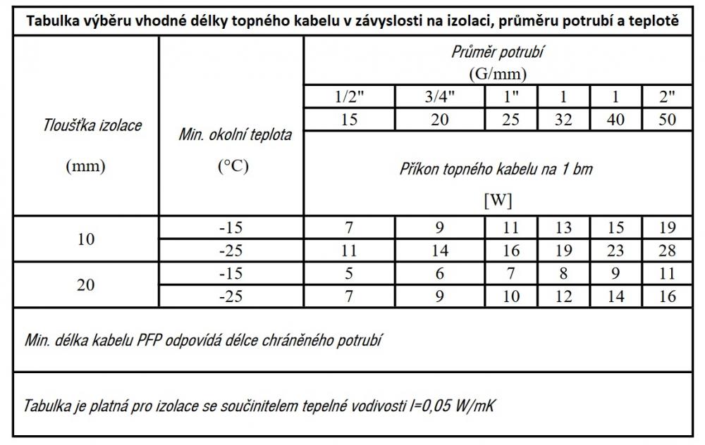 Vhodnou délku topného kabelu na potrubí si můžete sami zvolit pomocí tabulky ve fotogalerii, v návodu k použití, pomocí znalosti průměru potrubí, které chcete vyhřívat, minimální možné okolní teploty a plánované použité tloušťce izolace. Ze zmíněných tří parametrů zjistíte v tabulce potřebný příkon topného kabelu na běžný metr (bm) a poté tuto hodnotu vynásobíte délkou potrubí kterou potřebujete vyhřívat (chránit proti mrazu).
